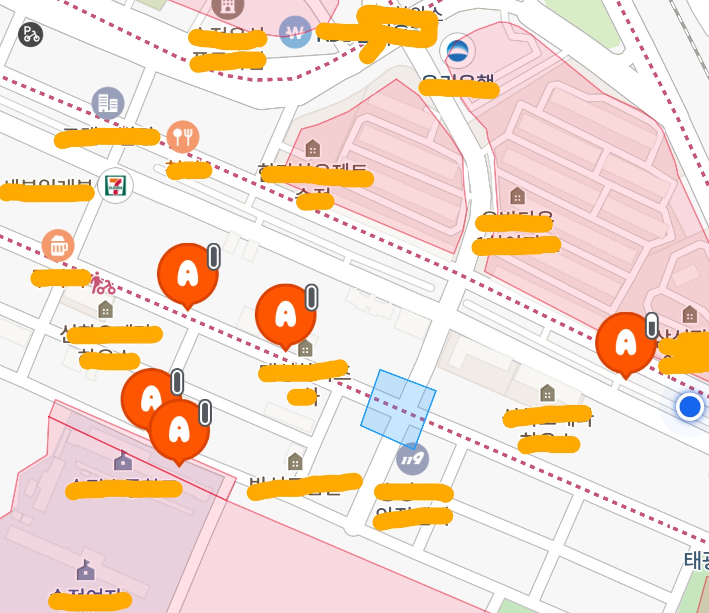 앱을 켜서 위치를 확인해보면 반납불가지역과, 반납권장지역이 나옵니다.