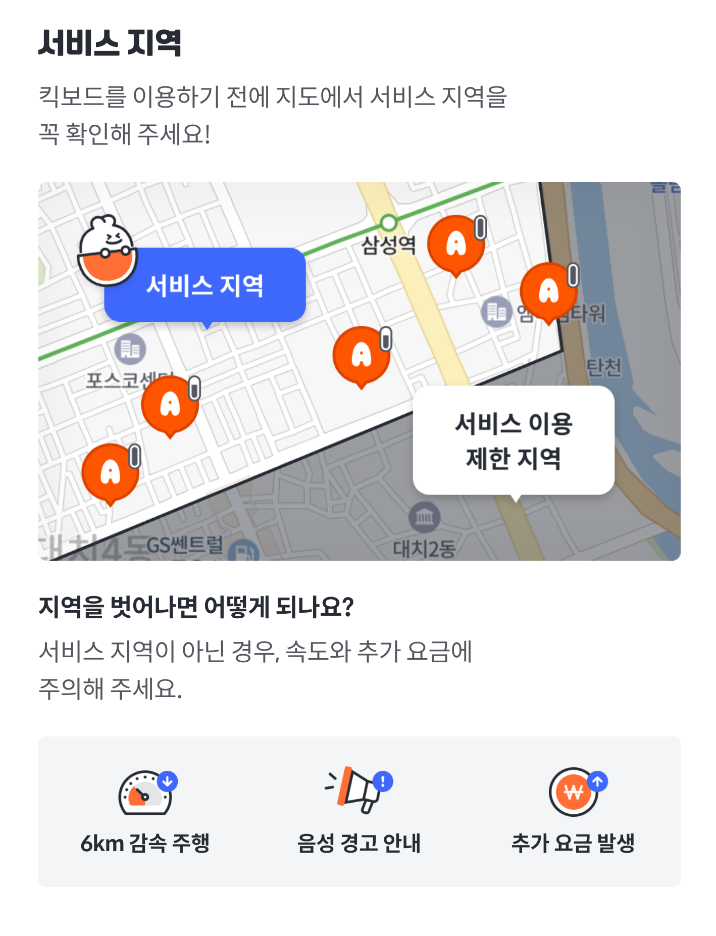 킥보드를 이용하기 전에 지도에서 서비스 지역을 꼭 확인해 주세요.