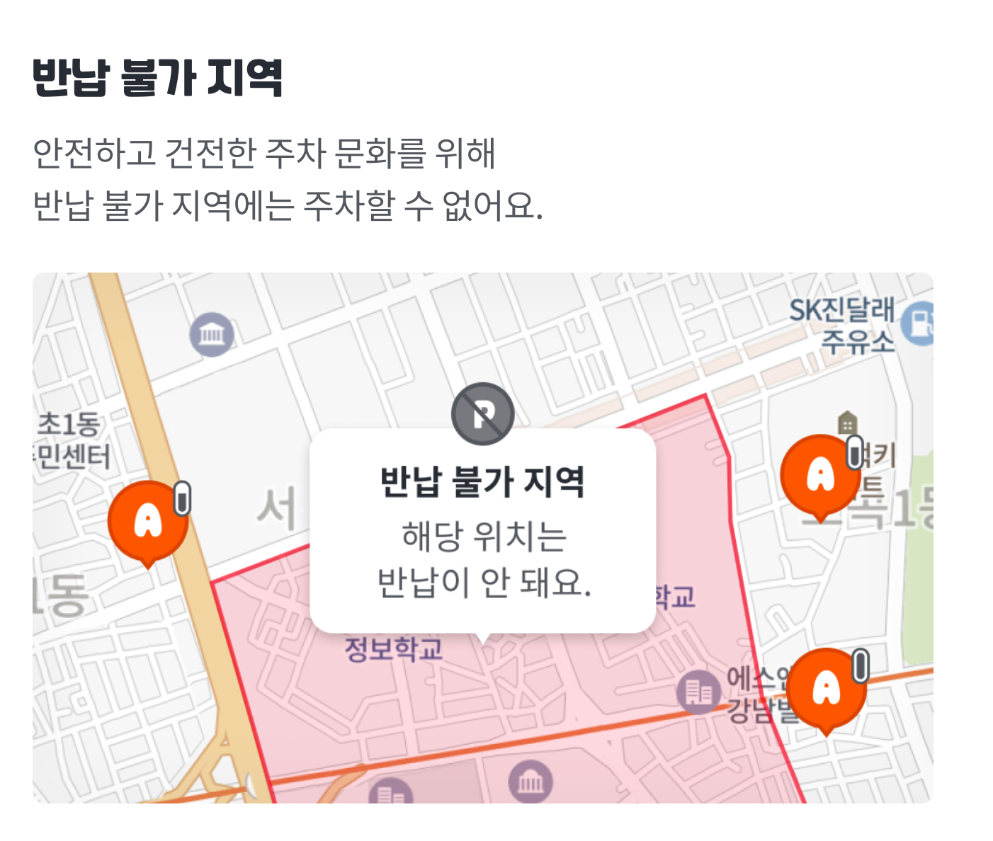 안전하고 건전한 주차 문화를 위해 반납 불가 지역에는 주차할 수 없습니다.