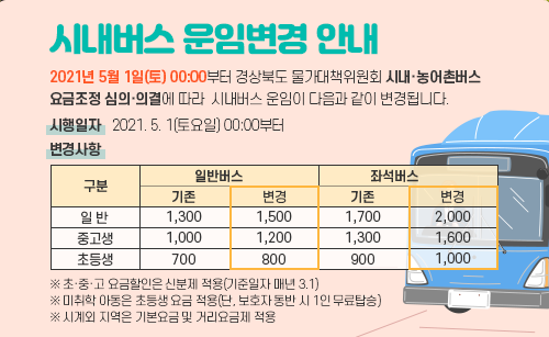 구미시에서 2021년 5월 1일 00시부터 시내버스와 농어촌버스의 운임 요금을 인상합니다.