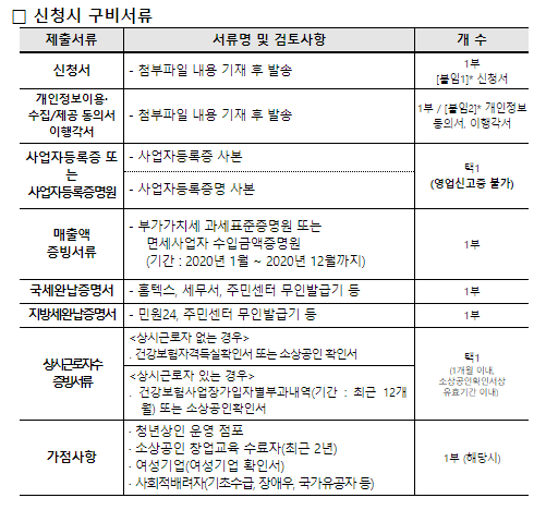 - 지원 제외 대상 : 프랜차이즈 직영점 또는 가맹점, 골프장, 무도장, 신용불량 사업자,