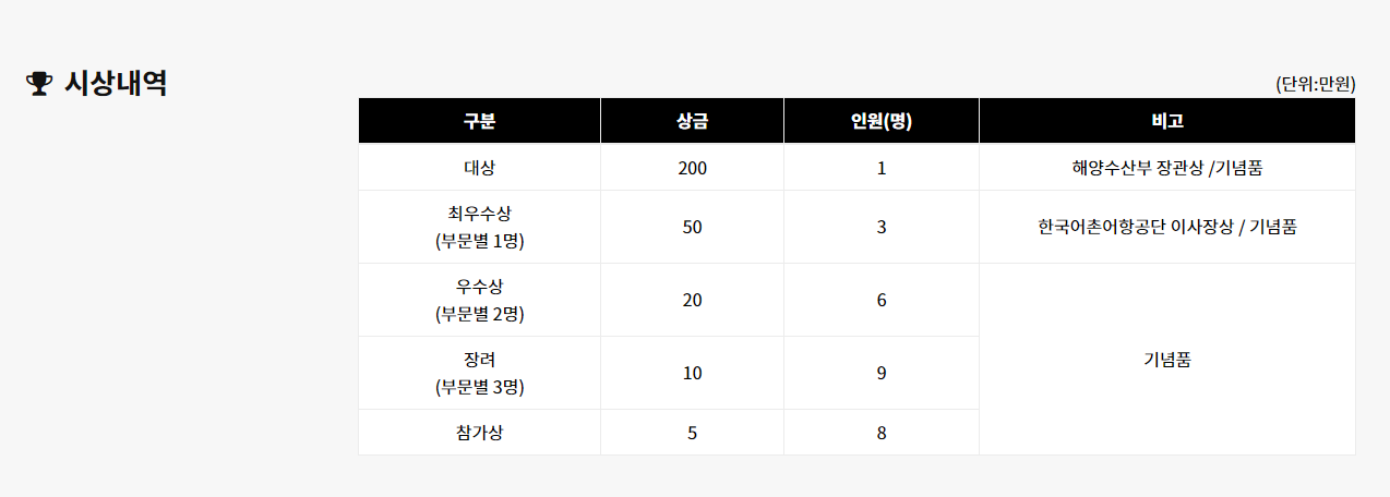 -최우수상(부문별 1명) : 각 50만원, 한국어촌어항공단 이사장상/기념품
