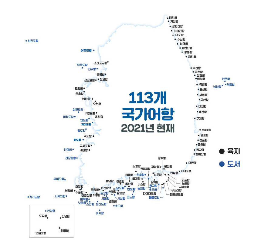 우리나라의 국가어항은 2021년 기준으로 113개의 어항을 보유하고 있습니다.