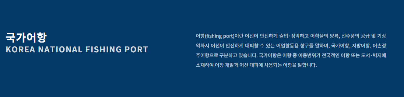 국가어항이란 어선이 안전하게 출입, 정박하고 어획물의 양륙, 선수품의 공급 및 기상악화시 어선이 안전하게 대피할 수 있는 어업할동용 항구를 말합니다.