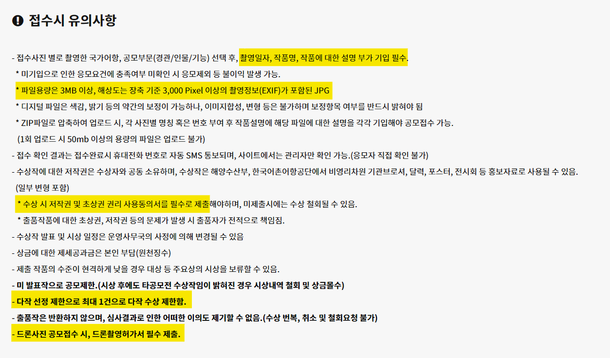 ◆ 다수 작품 응모 방법 : ZIP파일로 압축하여 업로드 시에도 각 사진마다 번호 부여 후, 촬영한 국가어항, 공모부문(경관/인물/기능) 기입 후, 촬영일자, 작품명, 작품에 대한 설명 등을 각각 기입해야 공모접수 가능합니다. (50mb 이상의 용량의 파일은 업로드 불가)