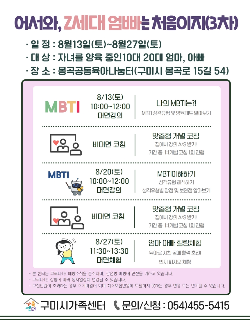 구미시가족센터에서 1020세대의 부모들을 위해 다양한 프로그램을 개설하였습니다.