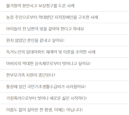 ● 도움 받을 수 있는 분야 : 채권, 채무, 이혼, 친권 양육권, 상속유언, 손해배상, 근로관계 임금, 개인회생, 파산 등 생활법률 전반에 관한 법률 서비스