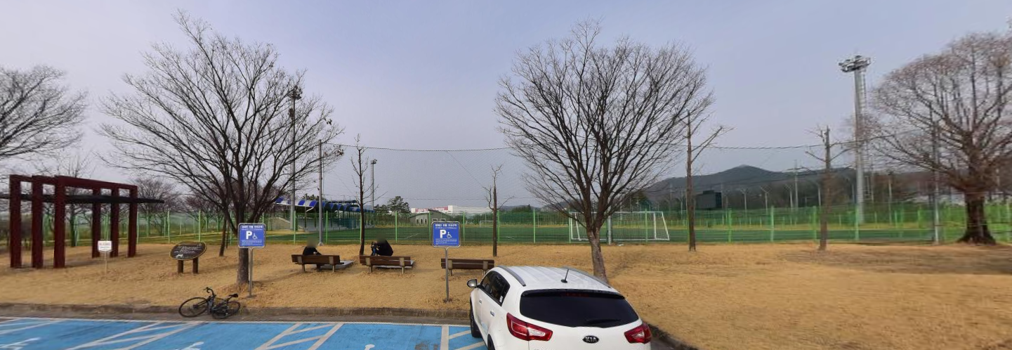 동락공원 인조잔디 축구장 앞, 넓은 주차장과 공용 화장실이 있습니다.