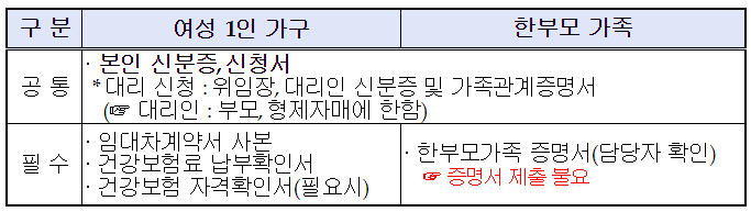 - 기준중위소득 140% 이하의 여성 1인 가구 또는 법정 한부모 가정