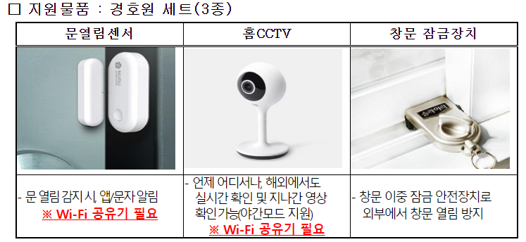 ● 지원물품 3종 : 문열림센서기, 홈CCTV, 창문 잠금장치
