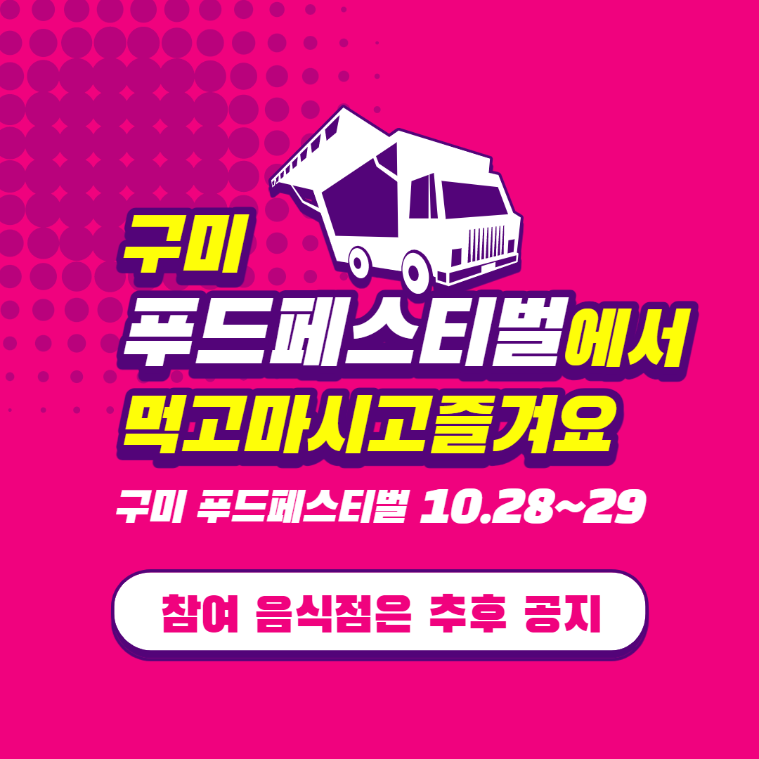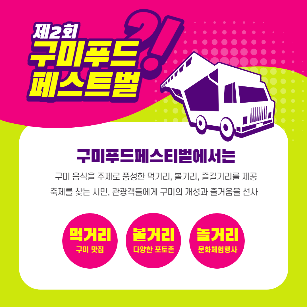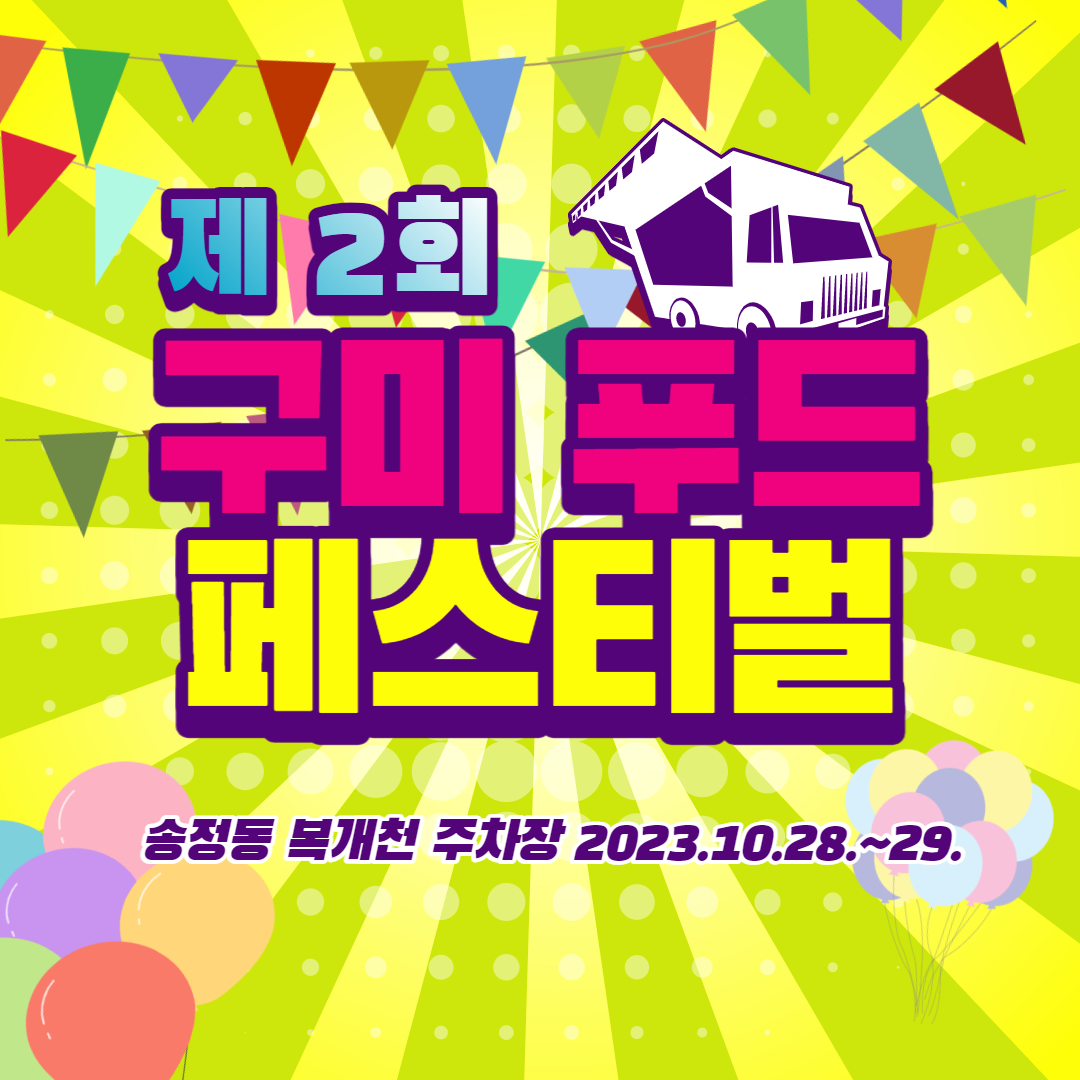 구미 음식을 주제로 풍성한 먹거리, 볼거리, 즐길거리를 제공하는 제 2회 구미 푸드 페스티벌은 2023년 10월 개최 예정입니다.