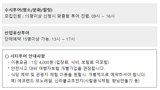 -인원 : 15명 이상 신청시 맞춤형 투어 진행