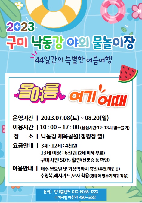 구미시 낙동강 야외물놀이장이 2023년에도 개장됩니다.