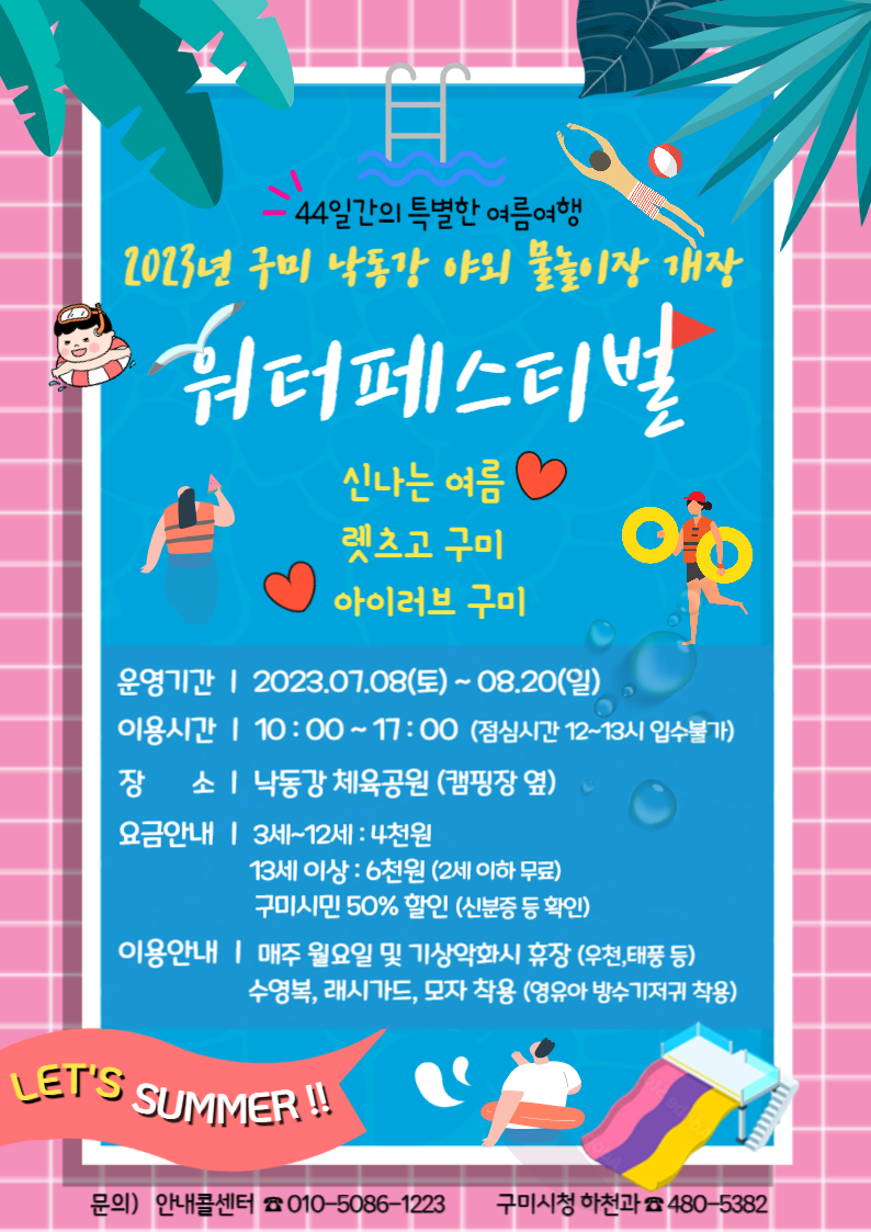 44일간 운영되는 2023년 구미 낙동강 야외 물놀이장은 주차장과, 탈의실,화장실, 쉼터, 튜브 대여, 풀장 등등 다양한 시설을 갖춘다고 합니다.