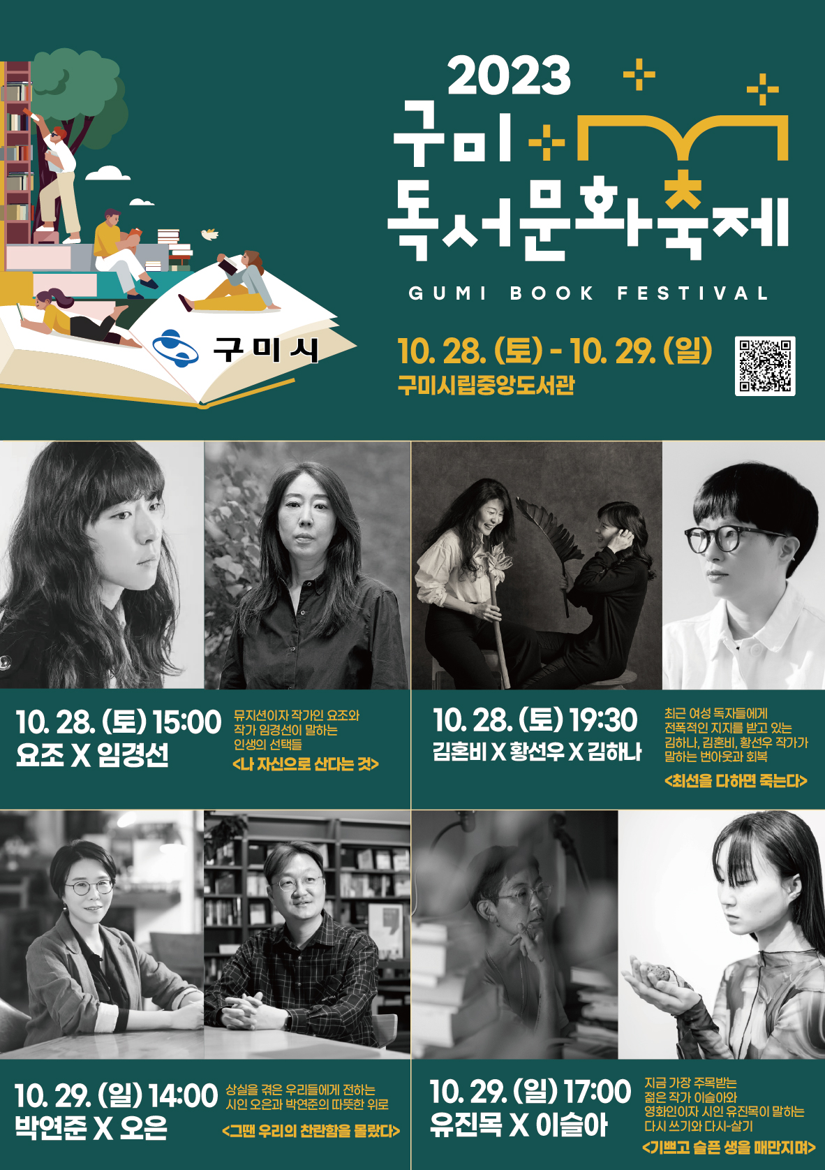2023 구미 독서문화 축제 북토크 참가 신청 안내 10월 28일 - 29일(2일) 북토크 일정 1) 10월 28일 토요일 오후 3시 30분 : 요조x임경선 2) 10월 28일 토요일 저녁 7시 30분 : 황선우x김혼비x김하나 3) 10월 29