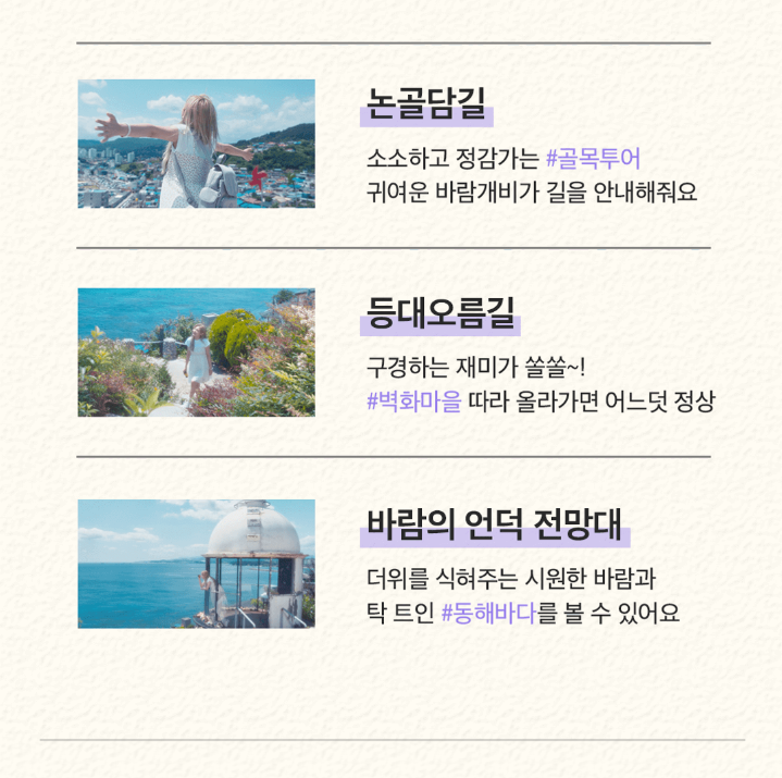바퀴달린 캐리어도 좋지만, 올 여름엔 가벼운 배낭여행으로 떠나보자는 취지로 동해 논골담길를 뽑았어요.